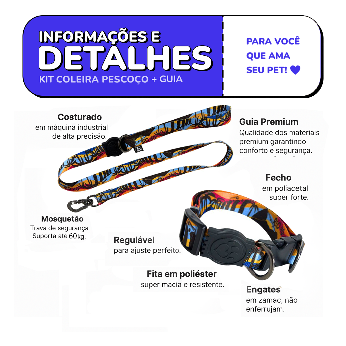 * Reguladores ajustáveis para acompanhar o crescimento do pet;